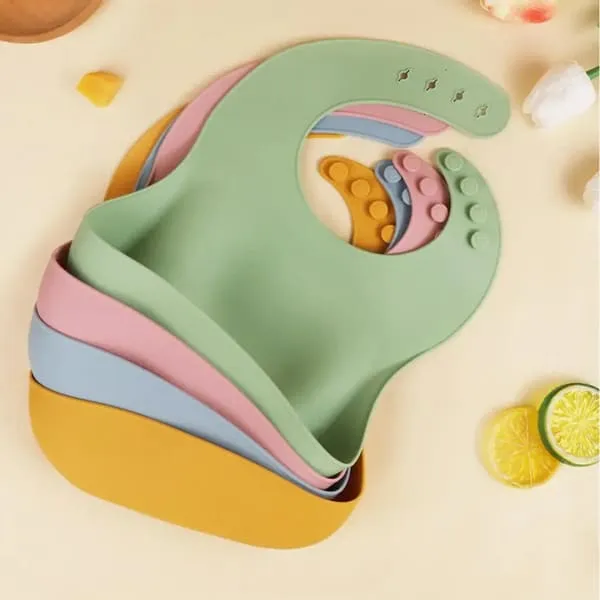 - Silicone Bib with Food Catcher: Soft, flexible, and