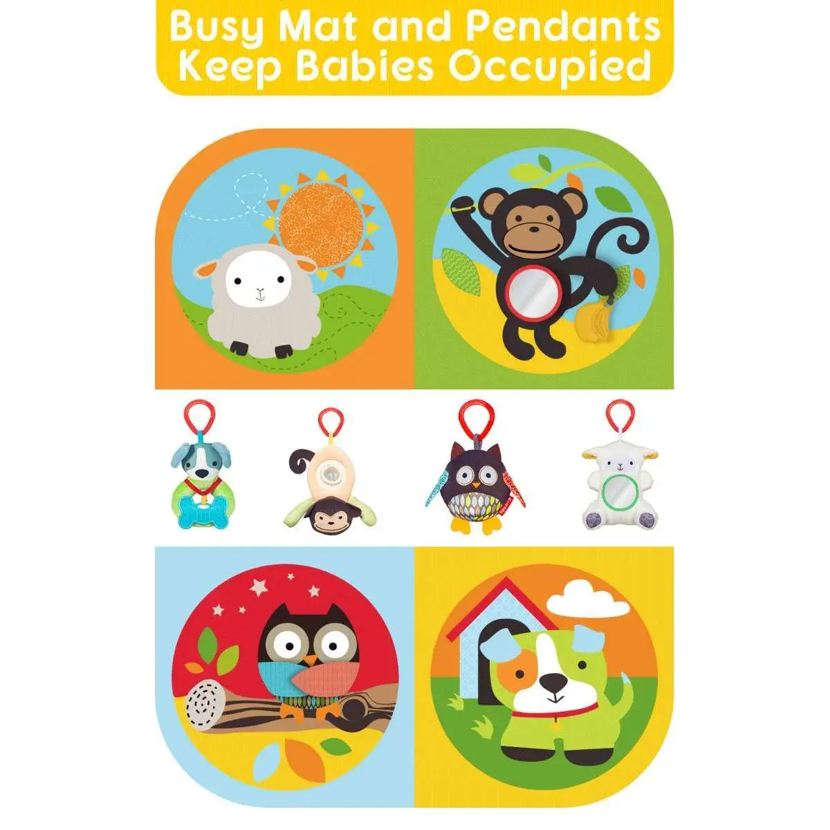 encourages prone play, reaching, grasping, and visual tracking, all while